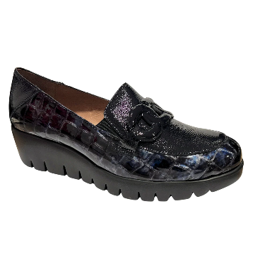 Loafers from Wonders is the ideal shoe to see you through Spring and Summer. Crafted in a stylish blue leather with a leather buckle design across the vamp. Chunky black wedge sole keeps the overall design coherent. Elegant snake skin pattern effect with gentle shimmer adds a hint of opulence to these not-to-be missed loafers.