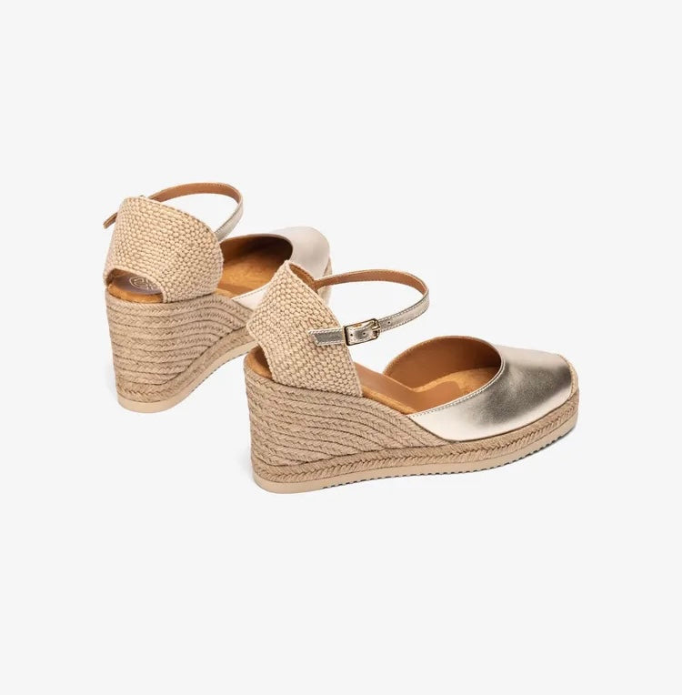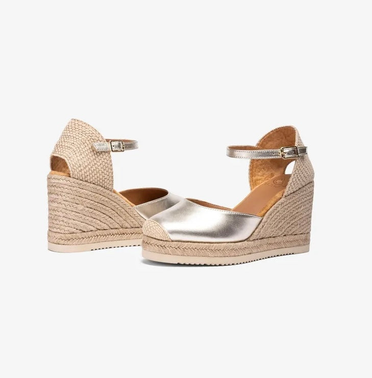 Round toe espadrille made in metallic leather. Raffia heel counter and a strap that can be adjusted with the metal buckle. 2cm platform and a 8.5cm wedge covered in jute. Lighter and more flexible EVA sole than ever before thanks to the Unisa Superlight technology.