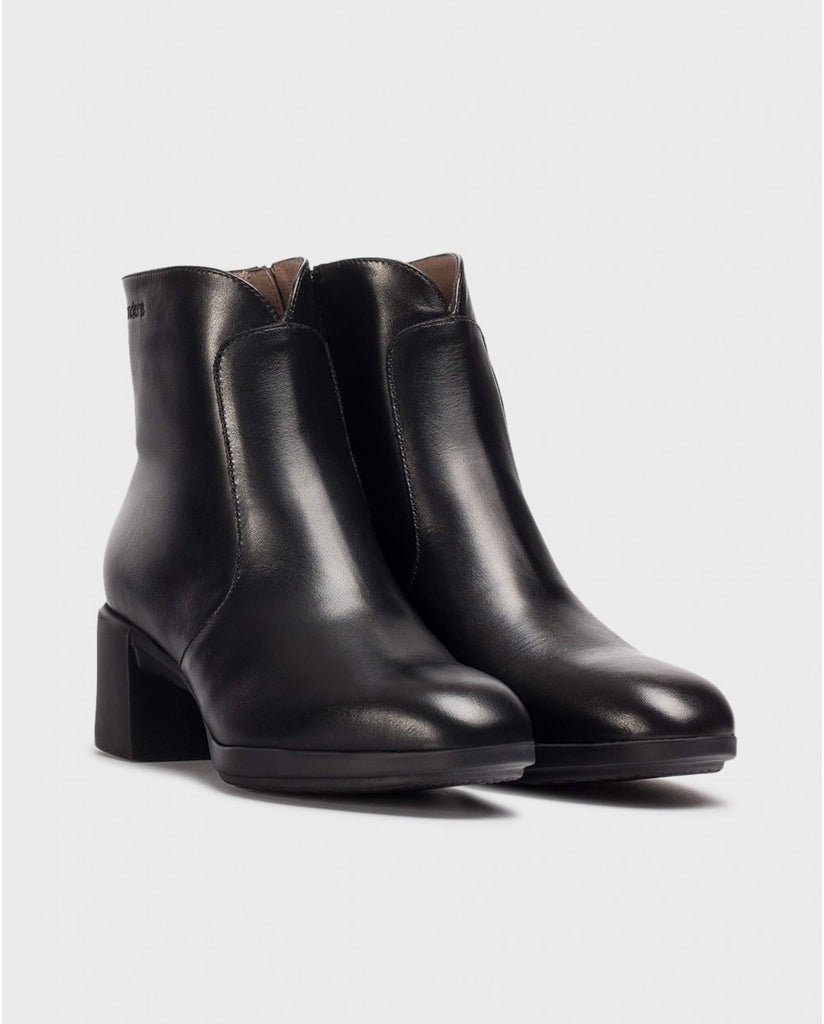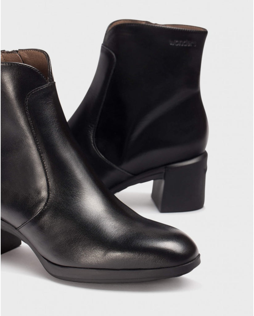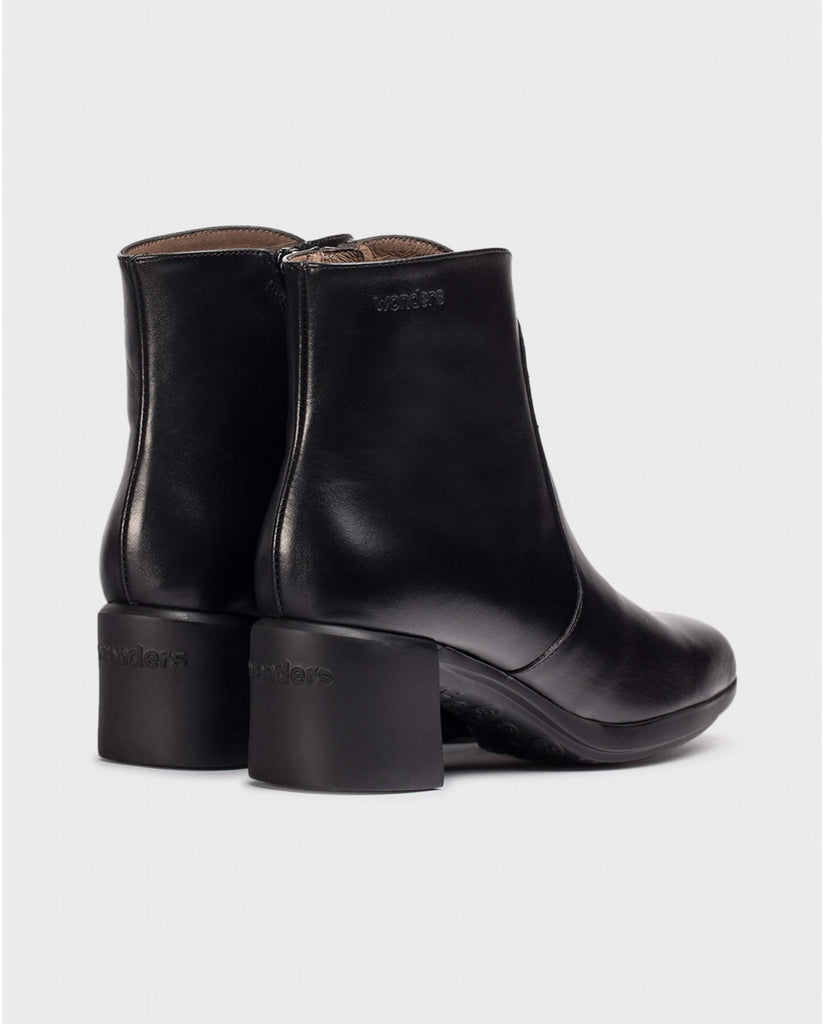 REGHOST 05 ankle boots crafted in smooth black leather. This minimalist and versatile design is defined by a clean silhouette and a distinctive V-shaped front on the shaft. The inner side zip ensures easy wear and a perfect fit. Its newly developed sole with block heel incorporates WondersFly™ technology, offering unmatched lightness, while the MemoryGel insole guarantees cushioned comfort with every step. Get ready to feel the #YesWeFly sensation. Wonders is committed to responsible manufacturing certified by LEATHERWORKINGGROUP.